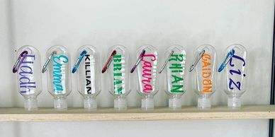 These easy to carry hand sanitizers are easily clipped on to back packs, handbags or clothing loops. With a name or initials this bottles won't get mixed up or lost like so many others. Call me for color options.